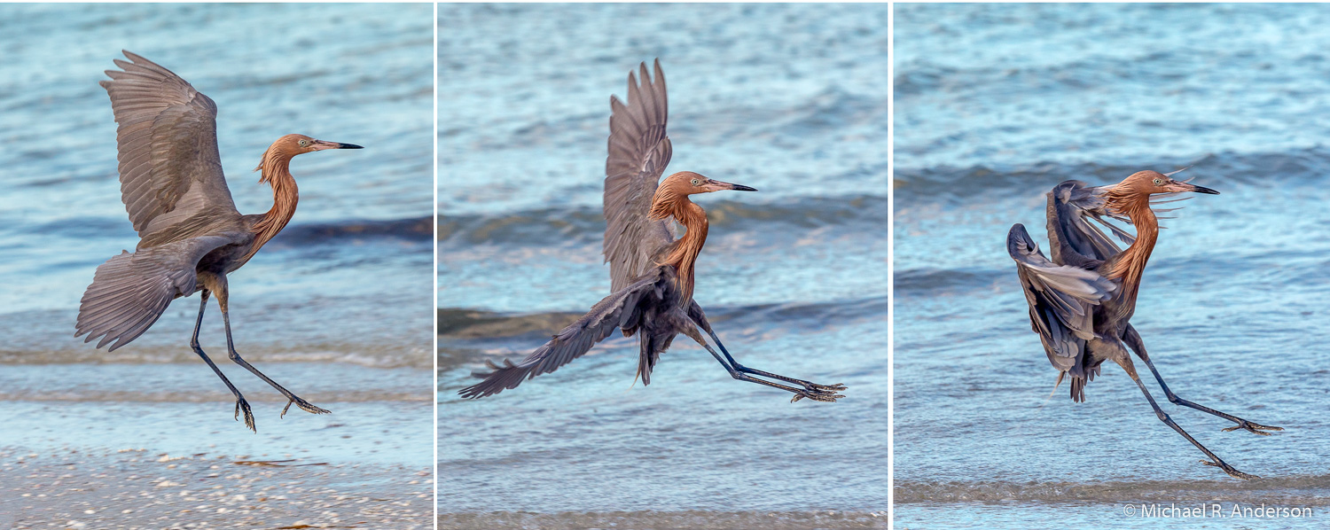 Further down the beach a reddish egret was gliding in for a landing. With my camera set to high-speed shutter I framed the bird and squeezed off a few shots. I could have sworn I heard the tires of a 757 hit the tarmac when this bird landed. My camera’s high speed shutter is rated at 7 frames-per-second and these three images all have exactly the same capture time right down to the second.