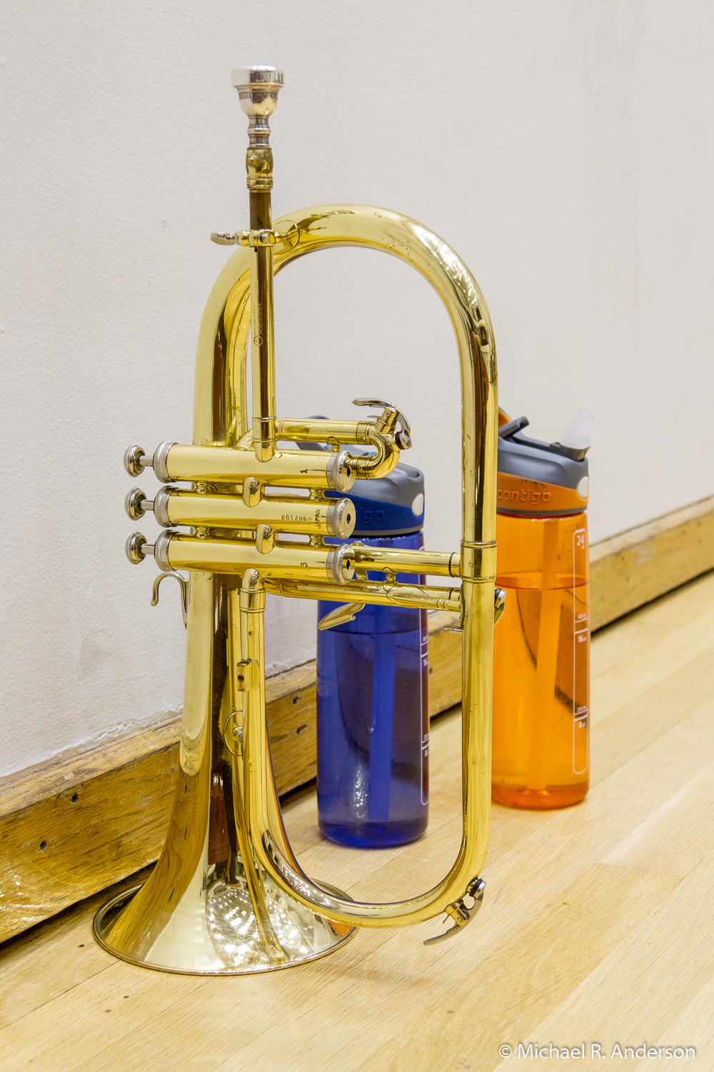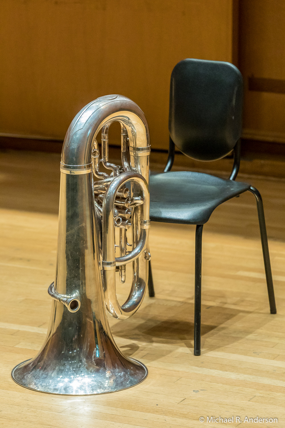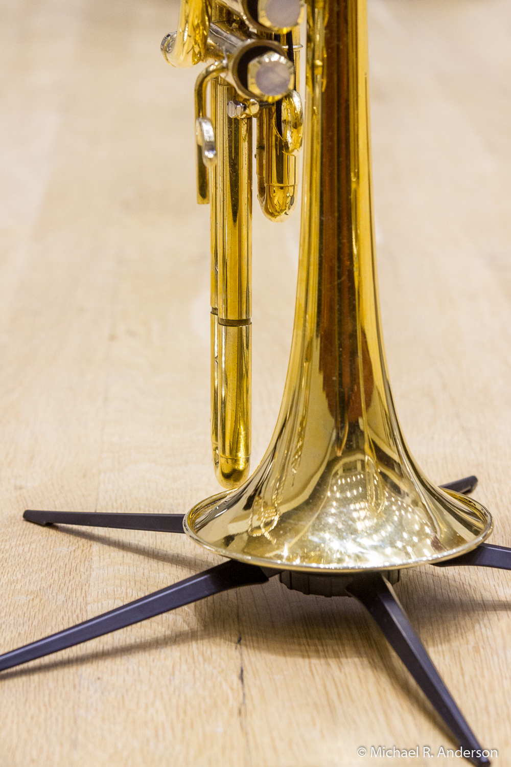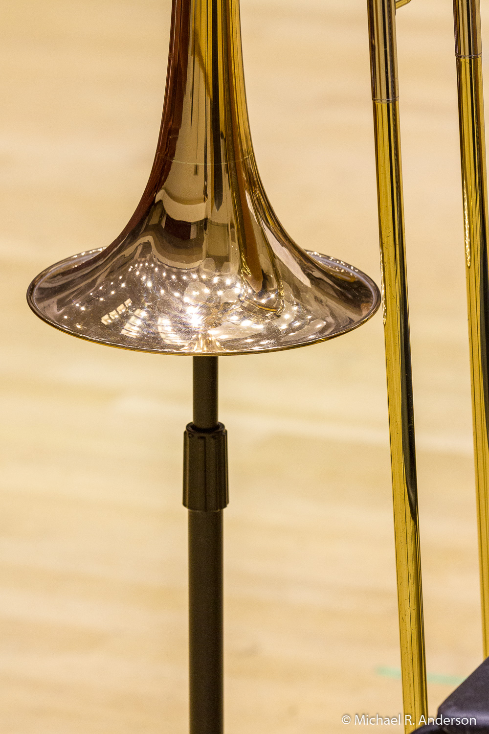 I know. I know. I just can’t seem to resist those shiny brass instruments! My apologies to players of strings, woodwinds, and percussion. I’ll try to do better this year. In my defense, however, I rarely photograph the symphony and those students seem reluctant to leave their instruments lying around. I often photograph the wind ensemble or jazz groups where the shinier instruments reside. To compensate, here’s a photo of me with my string instrument.