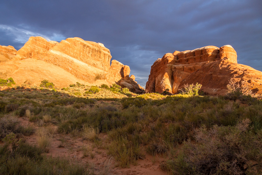 The sun was rising in the east casting dark shadows from the rock formations, but the clouds were dark in the west. Rain had been forecast for later in the day so I had my parka along. The first mile or so of the trail is quite wide and level and there are several side trails that lead to some interesting arches. I took them all. At one mile you encounter Landscape Arch, a surprisingly long thin span of rock that seems to defy gravity. Even if you only hike this far it would be worth the trip.